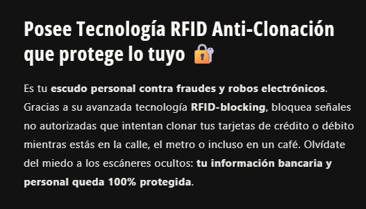 Tus datos están seguros, sin sacrificar estilo ni practicidad. Protege tu dinero y tu identidad en un solo accesorio compacto. Ideal para quienes se mueven en la ciudad y no pueden permitirse riesgos. ¡La seguridad que necesitás, al alcance de tu bolsillo!