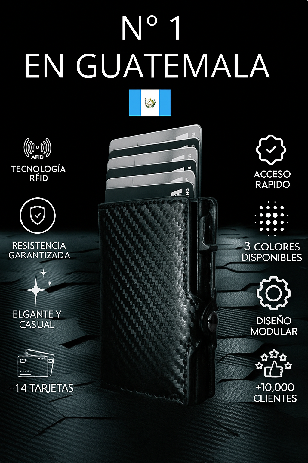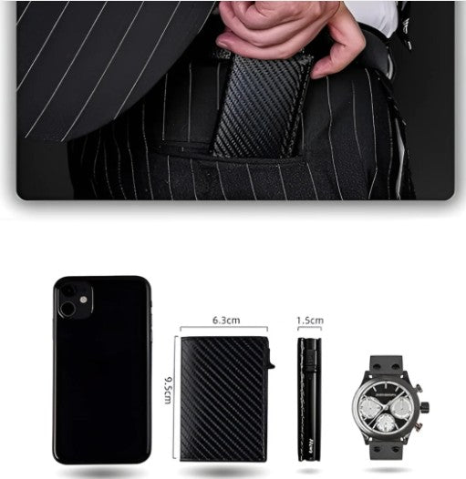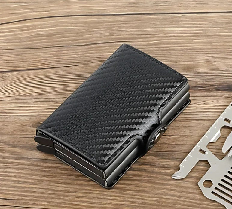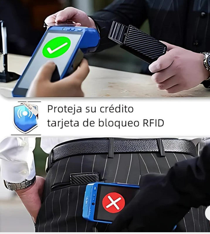 Hecha de cuero artificial con acabado en fibra de carbono, es resistente al agua y al desgaste. No se trata solo de una billetera: es un accesorio de confianza, elegante y a prueba de ladrones modernos.
