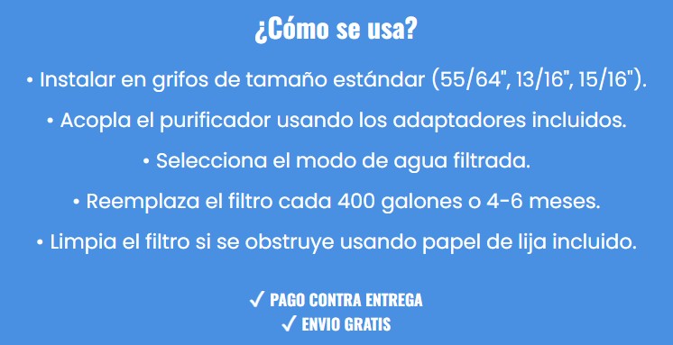 No esperes más para disfrutar de agua fresca y saludable directamente desde tu grifo. ¡Compra ahora y experimenta el sabor y la pureza que te mereces! Es fácil de instalar y se adapta a la mayoría de los grifos, ¡así que no hay excusas! 🌟